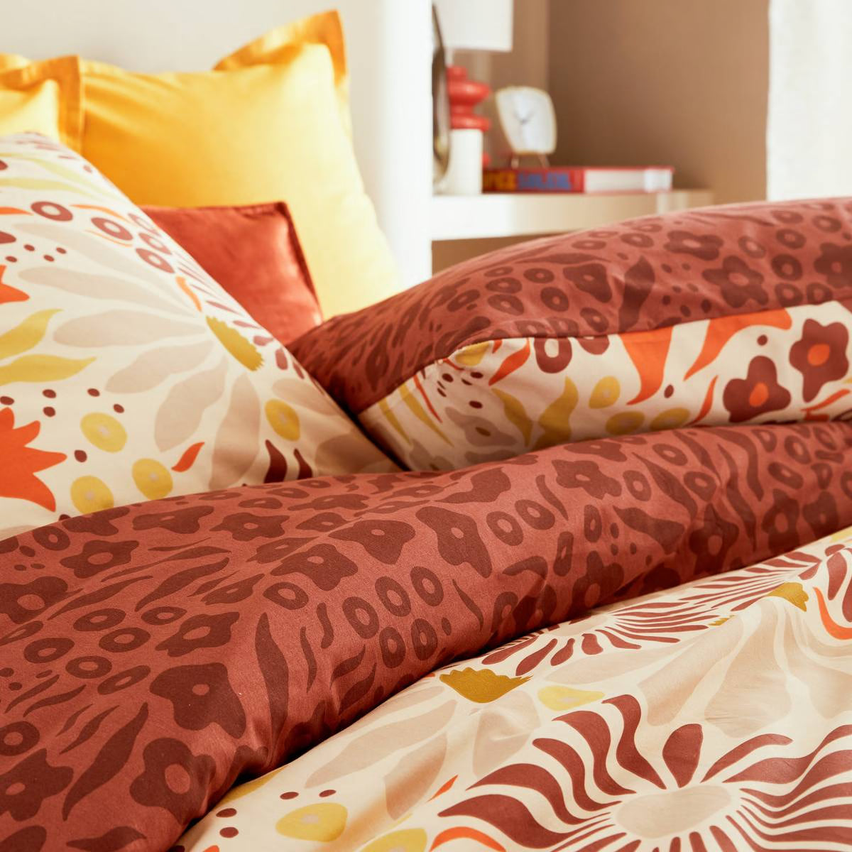 Комплектът е двулицев с напълно реверсивен дизайн – едната страна е красиво декорирана с деликатен принт, а другата е изчистена и едноцветна. Това ви позволява лесно да променяте стила на леглото според настроението си. Практичен и функционален, комплектът включва плик за завивка и две квадратни калъфки за възглавници, осигурявайки завършена и хармонична визия.