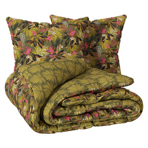 Комплектът е двулицев с напълно реверсивен дизайн – едната страна е красиво декорирана с деликатен принт, а другата е изчистена и едноцветна. Това ви позволява лесно да променяте стила на леглото според настроението си. Практичен и функционален, комплектът включва плик за завивка и две квадратни калъфки за възглавници, осигурявайки завършена и хармонична визия.