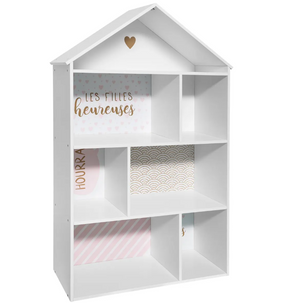 Етажерка във форма на къща, съчетаваща функционално съхранение и привлекателен декор за детската стая. Множество отделения осигуряват удобно място за играчки, аксесоари, меки играчки и книги, помагайки на детето да поддържа ред и да развива организираност.