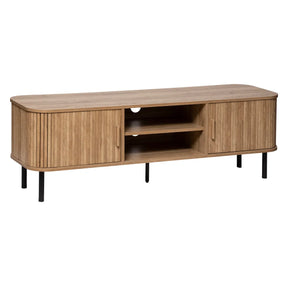 Шкафът разполага с две плъзгащи се врати с ефект „канелиран“ дизайн, които прикриват обособени ниши за подреждане на техника, аксесоари или декоративни елементи. Вградените отвори за кабели гарантират удобство и подреденост. Двете рафтови секции и страничните ниши предлагат достатъчно пространство за съхранение, а възможността за избор на дръжки в цвят дърво или черно добавя гъвкавост към стила.