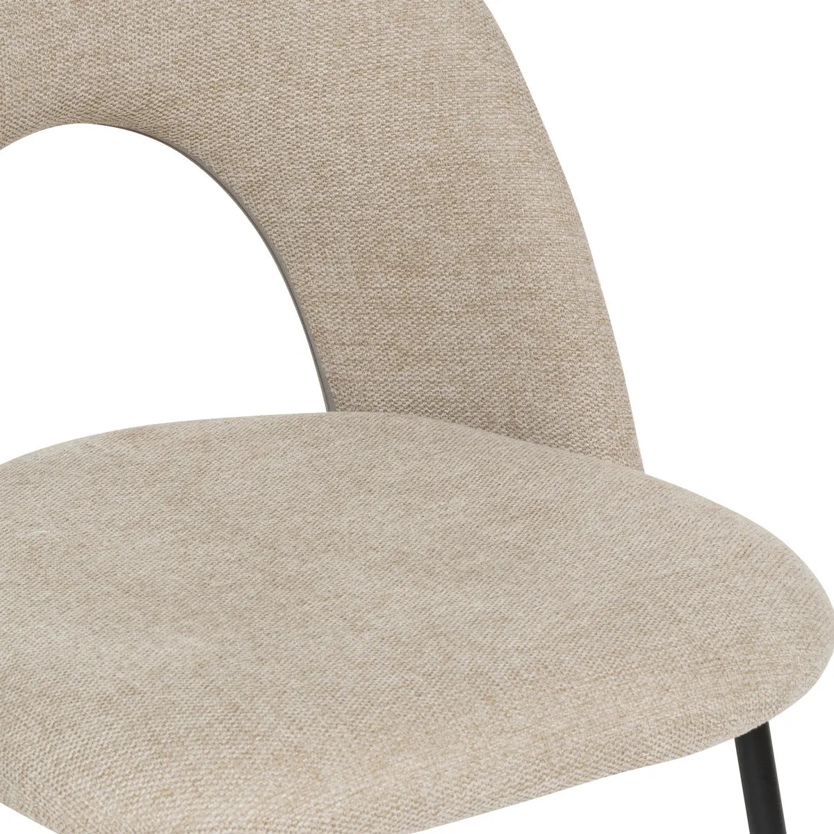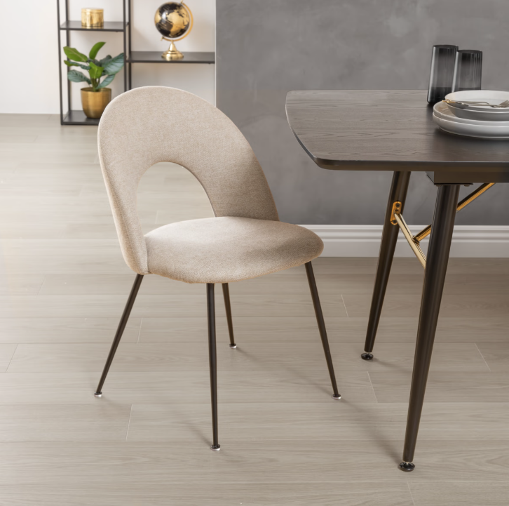 Столът Raven впечатлява с елегантен и изчистен дизайн, който лесно се вписва в съвременни интериори. Тапициран е с висококачествен плат в бежов цвят, който контрастира красиво с черните метални крака. Меката пяна в седалката и облегалката осигурява комфорт, а устойчивата конструкция гарантира стабилност. Перфектен избор за трапезария, особено в комбинация с маса от тъмно дърво и стилен килим за още по-уютна атмосфера.