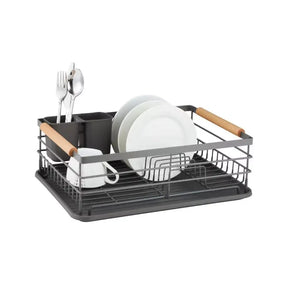Удобната многофункционална поставка за чинии осигурява стабилно подреждане, а отделящата се тава улеснява поддръжката и почистването. Моделът разполага с практични поставки за прибори и демонтиращи се приставки, които позволяват лесно сортиране и сушене на лъжици, вилици и ножове. Дървените дръжки от двете страни осигуряват удобно пренасяне и приятен тактилен акцент.