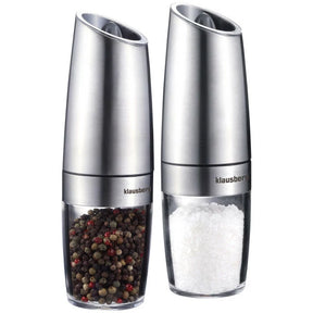 Комплект елегантни, гравитационни електрически мелнички за смилане на черен пипер, сол и други подправки с дизайнерски вид и иновативна форма, която осигурява удобство при употреба. Мелничките са удобни, функционални и лесни за употреба. Удобството при използване е гарантирано от иновативната гравитационна система, която се активира при накланяне на мелничката. Те ще направят така, че свежият аромат на подправките да изпълни дома и да придаде на ястията уникален вкус. Те перфектно ще допълнят оборудването на всяка кухня.