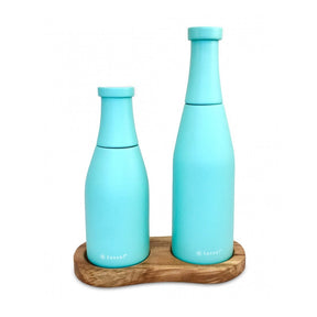 Трисъставен комплект мелнички за сол и черен пипер, изработени от гумирано дърво, лакирано в мента цвят.