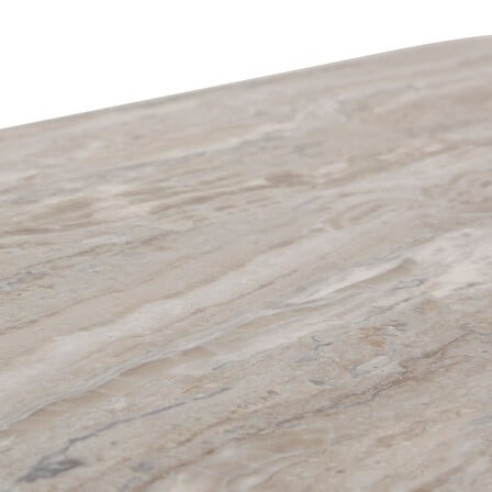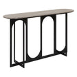 Стилна конзолна маса с овален плот и изчистен дизайн, която комбинира метална конструкция и MDF с PVC покритие в ефект сив мрамор. Покритието е устойчиво на влага и петна, което прави поддръжката лесна и удобна, а матовото покритие на металната структура придава модерен и елегантен акцент.