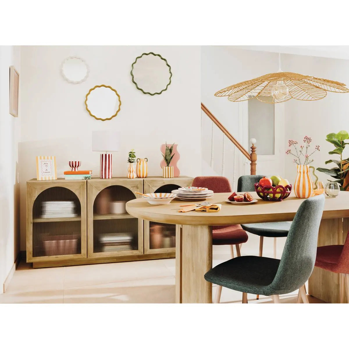Комплект от три кръгли огледала с вълнообразна форма и блестяща рамка. С размери 50 x 1,8 x 50 см и изработени от комбинация пластмаса, стъкло и картон, те са модерен и ефектен акцент за стената във всеки интериор.