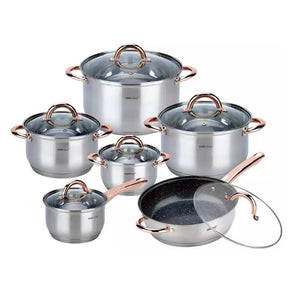 Комплект тенджери и тиган KingHoff 1766, 12 части, Тиган с мраморно покритие, Индукция, Инокс/златист