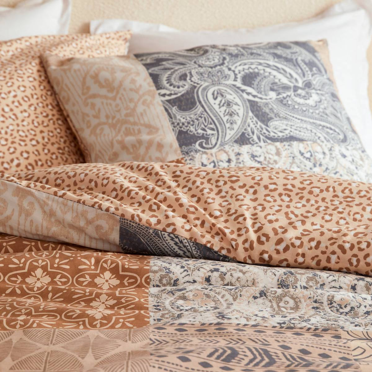 Комплектът е двулицев с напълно реверсивен дизайн – едната страна е красиво декорирана с деликатен принт, а другата е изчистена и едноцветна. Това ви позволява лесно да променяте стила на леглото според настроението си. Практичен и функционален, комплектът включва плик за завивка и две квадратни калъфки за възглавници, осигурявайки завършена и хармонична визия.