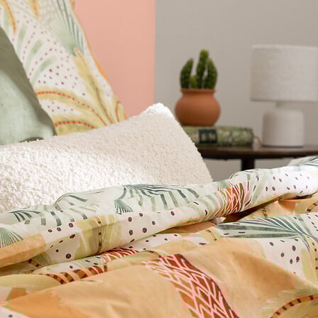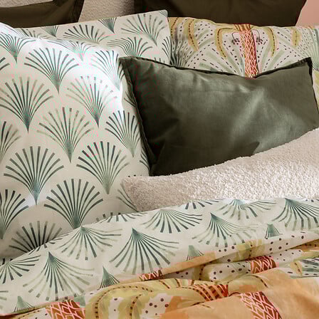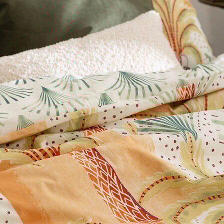 Комплектът е двулицев с напълно реверсивен дизайн, което ви позволява лесно да сменяте визията на спалнята според настроението си. Практичен и функционален, той включва плик за завивка и удобни квадратни калъфки за възглавници, създавайки завършен и хармоничен вид на леглото.