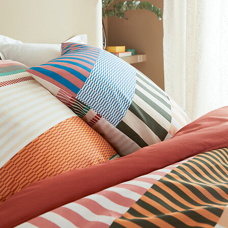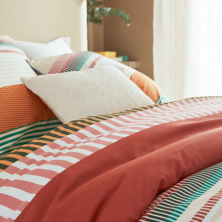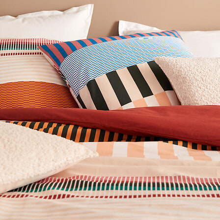 Комплектът е двулицев с напълно реверсивен дизайн – едната страна е красиво декорирана с деликатен принт, а другата е изчистена и едноцветна. Това ви позволява лесно да променяте стила на леглото според настроението си. Практичен и функционален, комплектът включва плик за завивка и две квадратни калъфки за възглавници, осигурявайки завършена и хармонична визия.