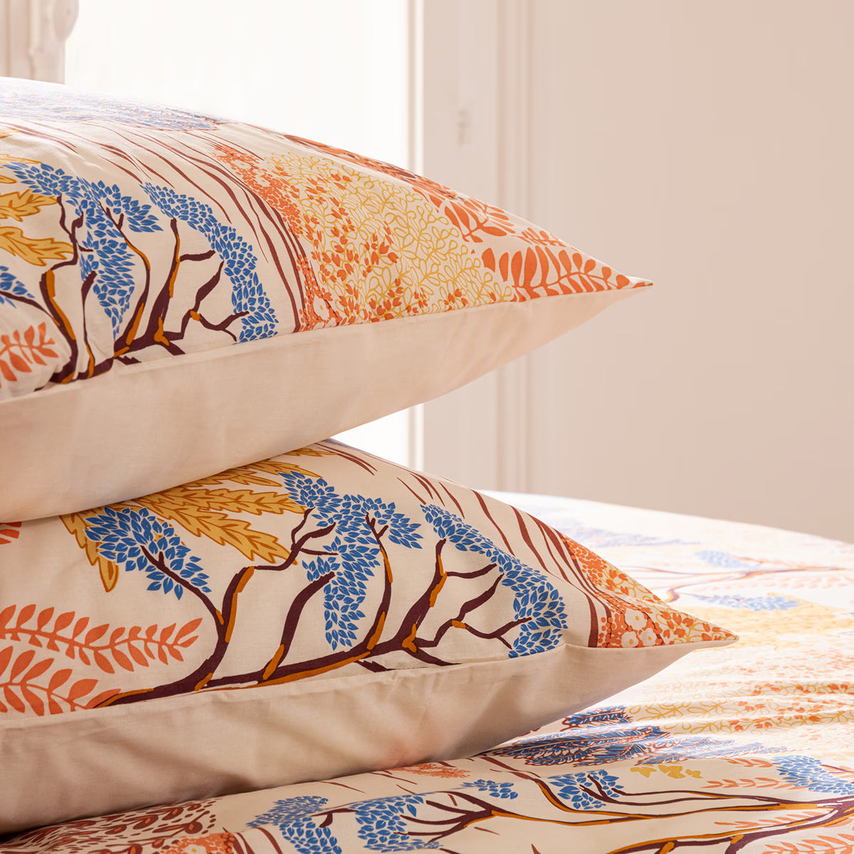 Комплектът е двулицев с напълно реверсивен дизайн, което ви позволява лесно да променяте визията на спалнята според настроението си. Практичен и функционален, той включва плик за завивка и удобни квадратни калъфки за възглавници, създавайки завършен и хармоничен вид на леглото.