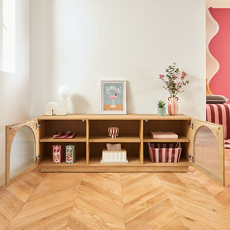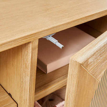 Елегантен ТВ шкаф с естествено излъчване, изработен от акация и MDF с бял ефект и бруширана текстура. Шкафът разполага с 6 отделения, регулируеми рафтове и врати със закалено оребрено стъкло, които придават изискан и модерен вид.