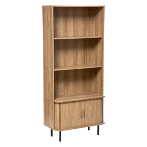 Стилна и функционална библиотека с изчистен дизайн и заоблени линии. Изработена е от MDF с покритие в ефект дъб и матова повърхност, а металните крака са прахово боядисани за издръжливост и елегантна визия.