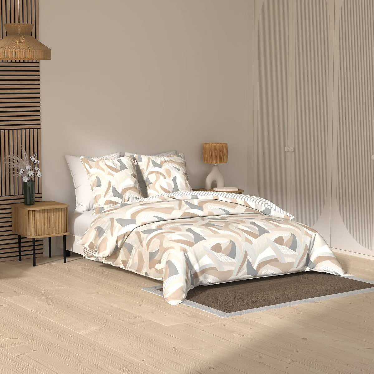 Комплектът е двулицев с напълно реверсивен дизайн – едната страна е красиво декорирана с деликатен принт, а другата е изчистена и едноцветна. Това ви позволява лесно да променяте стила на леглото според настроението си. Практичен и функционален, комплектът включва плик за завивка и две квадратни калъфки за възглавници, осигурявайки завършена и хармонична визия.