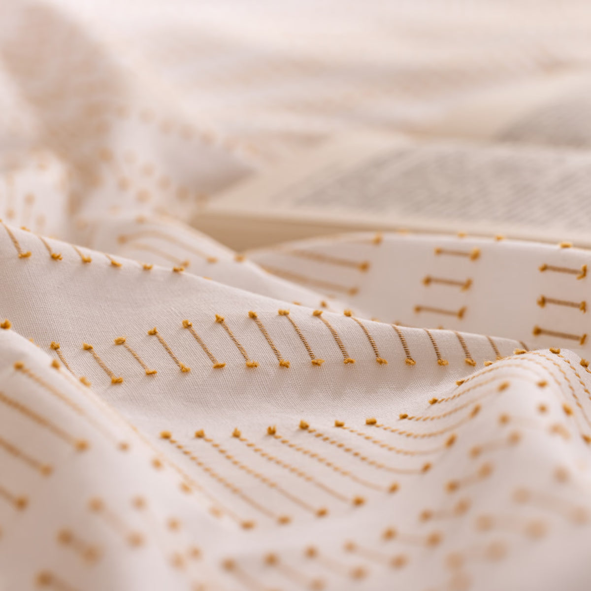 Комплектът е създаден за голяма двойна спалня и включва плик за завивка с размер 260 x 240 cm, както и две квадратни калъфки за възглавници 65 x 65 cm, които допринасят за завършен, хармоничен и стилен вид на леглото. Тъканата структура dobby създава усещане за премиум качество и придава изискан характер на спалното бельо.