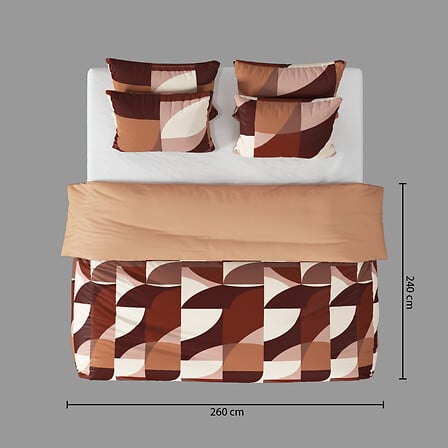 Комплектът е двулицев с напълно реверсивен дизайн, което ви позволява лесно да сменяте визията на спалнята според настроението си. Практичен и функционален, той включва плик за завивка и удобни квадратни калъфки за възглавници, създавайки завършен и хармоничен вид на леглото.