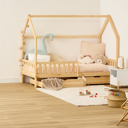 Детско легло с място за съхранение Монтесори Bosco с размери 194,8 × 98 × 155,5 см. Размери за матрак 90 × 190 см, изработено от бор и MDF. Леглото разполага с две чекмеджета за практично съхранение на дрехи, играчки или спално бельо и включена подматрачна рамка. Със своите размери и стабилна конструкция, то предлага множество възможности за декорация и е подходящо за широка възрастова група, съчетавайки комфорт и функционалност в детската стая. Тегло: 35,1 кг.