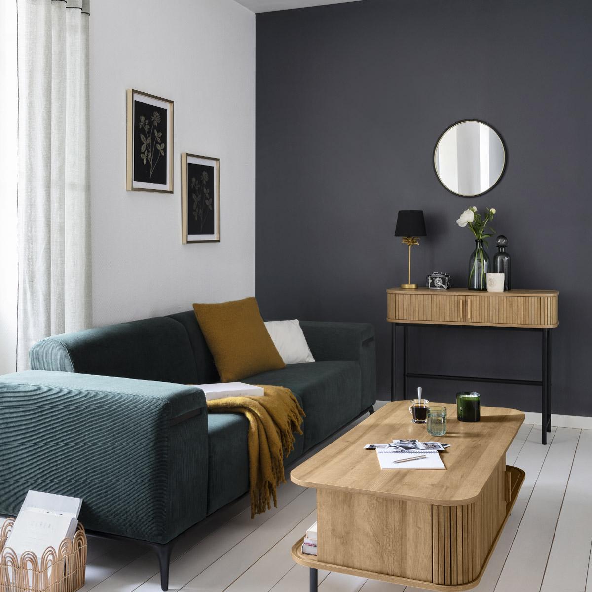 Елегантна конзолна маса Atmosphera Colva с изчистени линии и модерен дизайн. Плотът е правоъгълен със заоблени ръбове и е изработен от MDF с PVC покритие в дъбов ефект, което гарантира по-добра устойчивост на удари, влага и петна.